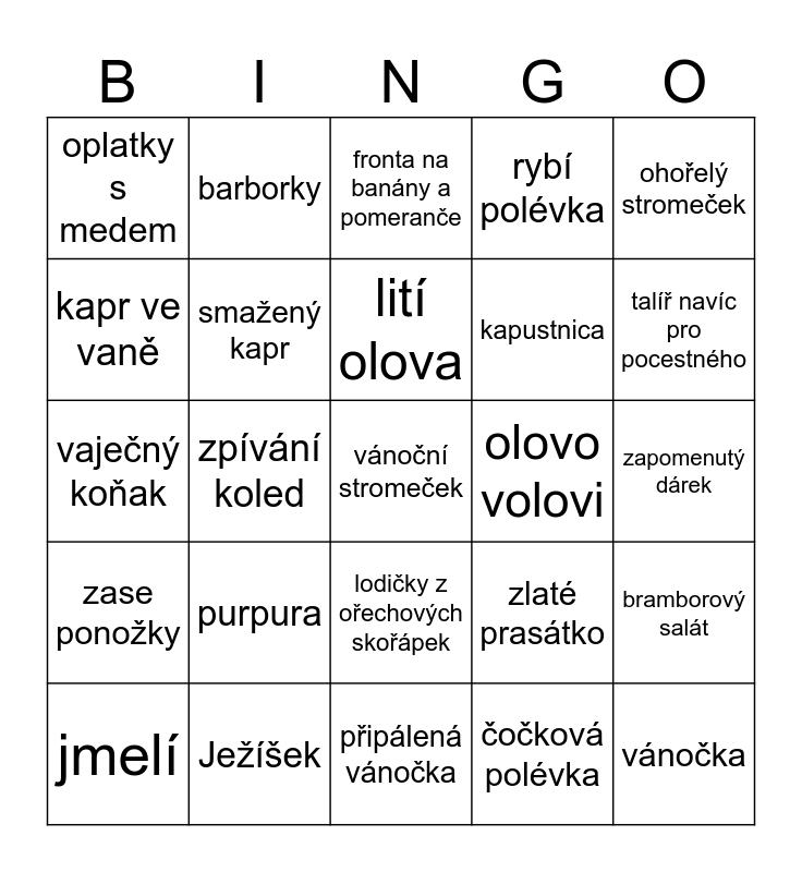 This bingo card has 48 words: Free!, vánoční stromeček, zapíchlá kost v krku, připálená vánočka, purpura, františek, barborky, Tři oříšky pro Popelku, kapr ve vaně, kapr v kádi, smažený kapr, rybí polévka, bramborový salát, zlaté prasátko, Karel Gott, Vánoce na blátě, lití olova, olovo volovi, dávám bolševikovi rok, maximálně dva, ohořelý stromeček, zpívání koled, čočková polévka, oplatky s medem, kapustnica, zkažený bramborový salát, talíř navíc pro pocestného, jmelí, rybí šupina pod talířem, lodičky z ořechových skořápek, zase ponožky, prskavky, Tři Králové, Josef Lada, andělské zvonění, Ježíšek, cukroví, spálené cukroví, zapomenutý dárek, Mikuláš, čert a anděl, krájení jablka, házení střevícem, vánočka, fronta na banány a pomeranče, svařák, vaječný koňak, vánoční trhy, turbomošt and Štědrý den.