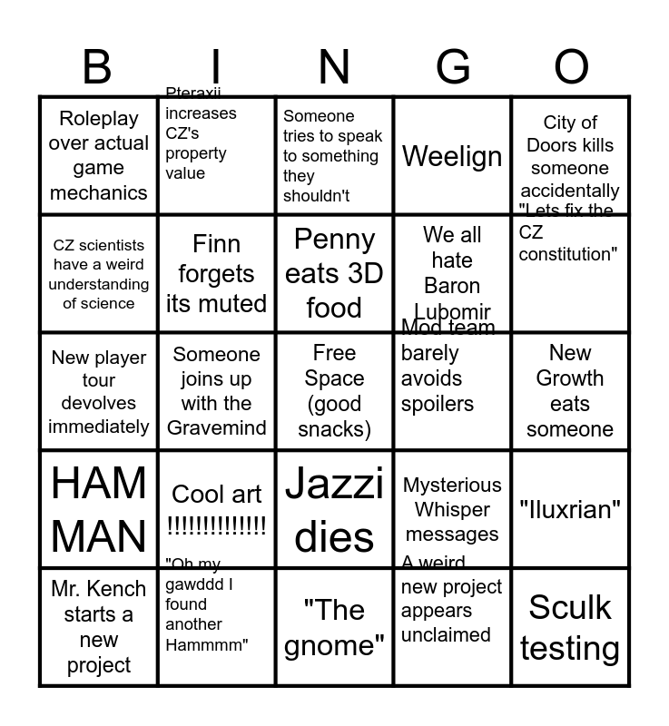 This bingo card has a free space and 94 words: Dr. Leviticus Cain crashes out, New monkey machine, "The gnome", Papa's ham economy crumbles, Leon plays Farm Merge Valley, "can someone sleep please", Rituals, Mr. Kench starts a new project, Tide says something vague, Penny's particles betray her lurking, Evelynn loses another humanity point, Mod team places rails on the track in real-time, New lore makes things weirder/worse, We all hate Baron Lubomir, "Don't worry about it", City of Doors kills someone accidentally, Someone tries to speak to something they shouldn't, Misery Pit, "By the Gravemind", John Patient remembers he's co-mayor, Lady Hark appears and then disappears, Berthinta, Drowned Texas, "Byarg", Cool art !!!!!!!!!!!!!!, Finn forgets its muted, Someone calls Owen Evelynn, Tilly says "literally me", Isaiah mispronounces a word, Second vc becomes the main vc, "Oh my gawddd I found another Hammmm", Jazzi dies, "Jouhlar ____", "Solomon Grundy born on a Mondy", Pteraxii increases CZ's property value, The Journalist decides something evil is "her pookie", Free Space (Moral ambiguity), Someone gets put in the microwave, Penny eats 3D food, Mysterious Whisper messages, New player tour devolves immediately, HAM MAN, New Growth eats someone, Carbon dating, Sculk testing, The Sculk Spreads, Sidequest becomes realquest, Someone tries to break minecraft, Someone sells their soul for fun/profit, Ant messes up a command, Lyra rearranges floorboards, A weird new project appears unclaimed, Nephilim lore drop, Papa needs to "repair" a weapon, Lyra fixes a monkey machine, "What the flip", "What did I miss guys" - *cue overlapping explanations*, How many old houses are there again???, "It's peam", Funny joke becomes accidental foreshadowing, Someone joins up with the Gravemind, Harrowgrowth appears at the worst possible time, "Big Big ______", Improv is hard :(, Papa items are cursed for no reason, Desperate Ham hunting, Someone ruins their health for Science(tm), "You know what they say in Parkour Civilization", CZ scientists have a weird understanding of science, "Ok it's bedtime now!" (it was not), Animal sacrifice for fun/profit, Someone loses all their valuables, Lore item disappears from really dumb RNG, 2 hours to organize 2 hours to actually do the quest, Weelign, Rumormonger- "Ask Tide about his Weird Rock", Trident battle is two ships passing by for 30 minutes, "Lets fix the CZ constitution", "Iluxrian", 3 plots all collide at the same time, Murder is an inconvenience, Mr. Kench is the only one having a good time, Character has a title instead of a name, Mod team barely avoids spoilers, Roleplay over actual game mechanics, 700 Potion Effect Punishment, 3 Day Blinding Stew, New growth/Old Growth Beef, Attribute modifiers, 10 thousand overlapping particle effects, Penny livestreams herself doing something bonkers, George Spooky's ghost looms large, Sky Lord Stinkorim and Someone almost curses.