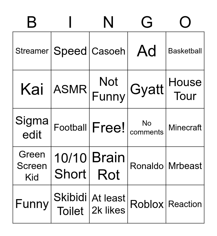 This bingo card has a free space and 24 words: 10/10 Short, Skibidi Toilet, Not Funny, Funny, Basketball, Streamer, Kai, Speed, No comments, Brain Rot, Gyatt, Sigma edit, Ronaldo, Mrbeast, ASMR, Roblox, Minecraft, Casoeh, House Tour, Football, Reaction, Green Screen Kid, Ad and At least 2k likes.
