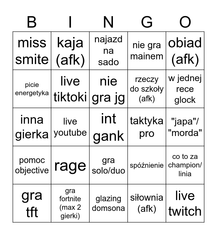 This bingo card has 25 words: rage, glazing domsona, nie gra jg, gra tft, obiad (afk), miss smite, picie energetyka, kaja (afk), taktyka pro, gra solo/duo, rzeczy do szkoły (afk), inna gierka, spóźnienie, co to za champion/ linia, live tiktoki, live twitch, "japa"/ "morda", najazd na sado, w jednej rece glock, live youtube, int gank, gra fortnite (max 2 gierki), pomoc objective, nie gra mainem and siłownia (afk).