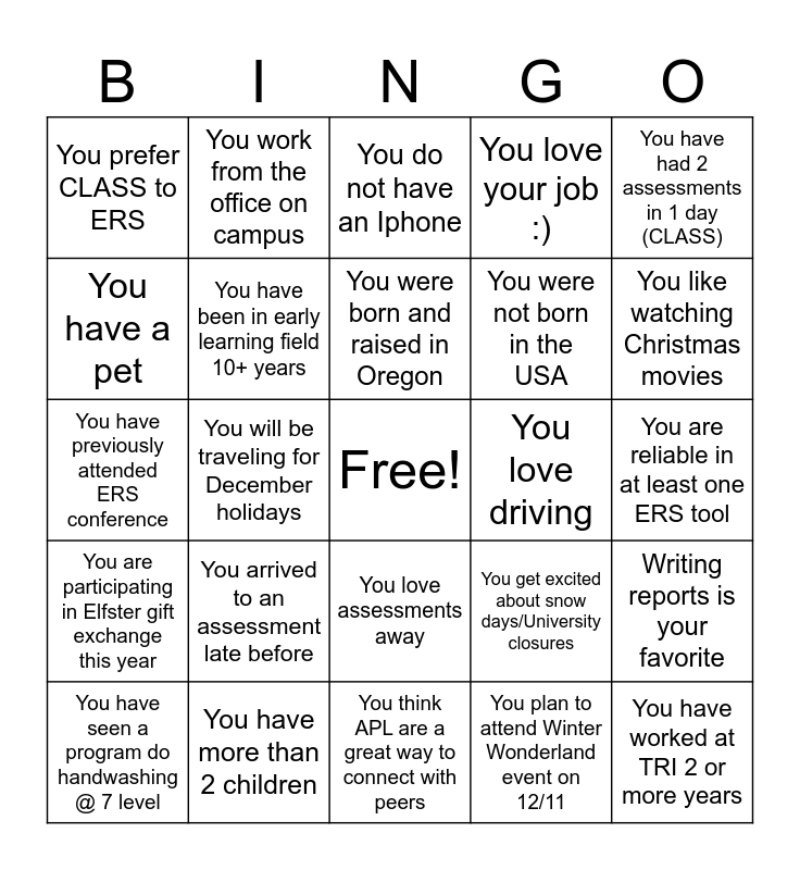 This bingo card has a free space and 24 words: You arrived to an assessment late before, You have more than 2 children, You were born and raised in Oregon, You have seen a program do handwashing @ 7 level, You have had 2 assessments in 1 day (CLASS), You prefer CLASS to ERS, You have a pet, You work from the office on campus, You love driving, You love assessments away, You were not born in the USA, You have previously attended ERS conference, You get excited about snow days/University closures, Writing reports is your favorite, You have been in early learning field 10+ years, You plan to attend Winter Wonderland event on 12/11, You are reliable in at least one ERS tool, You do not have an Iphone, You like watching Christmas movies, You will be traveling for December holidays, You have worked at TRI 2 or more years, You are participating in Elfster gift exchange this year, You love your job :) and You think APL are a great way to connect with peers.