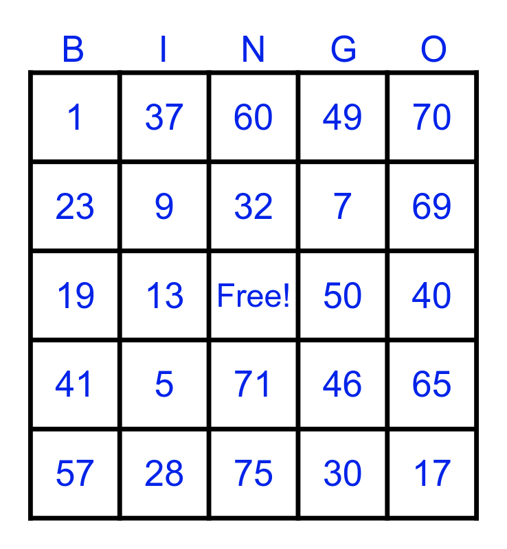 This bingo card has a free space and 24 words: 5, 28, 32, 57, 70, 1, 23, 37, 50, 71, 7, 19, 46, 65, 9, 30, 40, 60, 69, 13, 17, 41, 49 and 75.