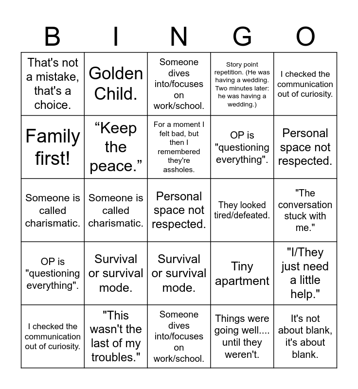 This bingo card has 50 words: It's not about blank, it's about blank., Personal space not respected., AI says punctuation out loud when it shouldn't., Someone dives into/focuses on work/school., Survival or survival mode., "We need to talk." or "Can we talk?", Golden Child., A mentor who is not a mother, father, or sibling., Family first!, "This wasn't the last of my troubles.", “Keep the peace.”, Story point repetition. (He was having a wedding. Two minutes later: he was having a wedding.), "I/They just need a little help.", Tiny apartment, "The conversation stuck with me.", "You're being dramatic." or "Stop being dramatic.", For a moment I felt bad, but then I remembered they're assholes., They looked tired/defeated., I am/was the dependable one., I checked the communication out of curiosity., Someone is called charismatic., Things were going well.... until they weren't., That's not a mistake, that's a choice., OP is "questioning everything"., A wild lawyer appears!, It's not about blank, it's about blank., Personal space not respected., AI says punctuation out loud when it shouldn't., Someone dives into/focuses on work/school., Survival or survival mode., "We need to talk." or "Can we talk?", Golden Child., A mentor who is not a mother, father, or sibling., Family first!, "This wasn't the last of my troubles.", “Keep the peace.”, Story point repetition. (He was having a wedding. Two minutes later: he was having a wedding.), "I/They just need a little help.", Tiny apartment, "The conversation stuck with me.", "You're being dramatic." or "Stop being dramatic.", For a moment I felt bad, but then I remembered they're assholes., They looked tired/defeated., I am/was the dependable one., I checked the communication out of curiosity., Someone is called charismatic., Things were going well.... until they weren't., That's not a mistake, that's a choice., OP is "questioning everything". and A wild lawyer appears!.
