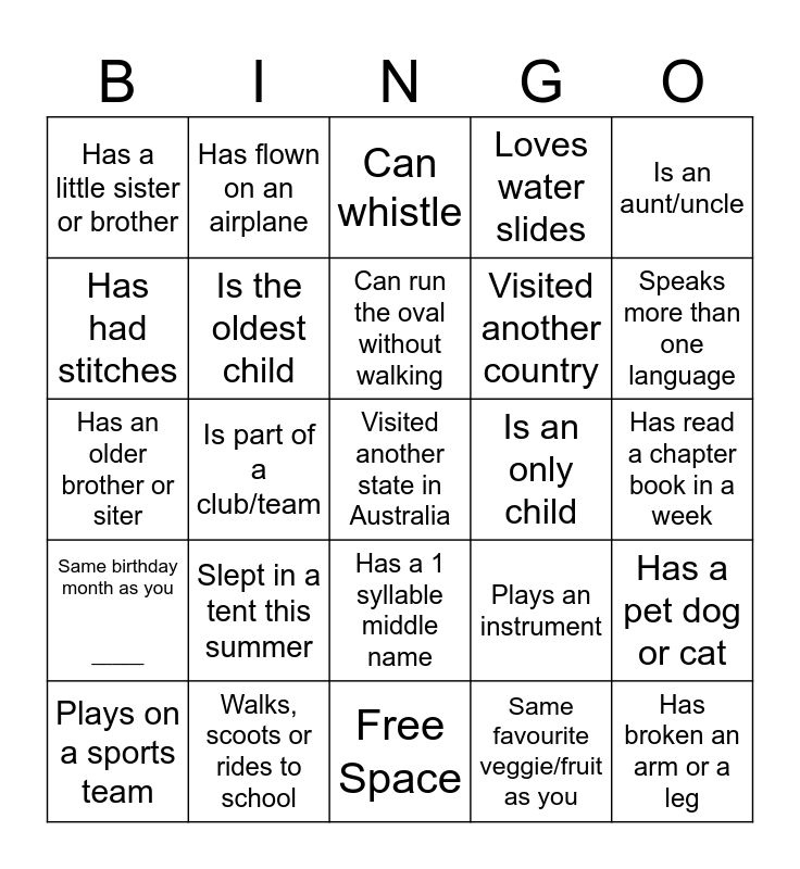 This bingo card has 25 words: Same birthday month as you _____, Walks, scoots or rides to school, Visited another state in Australia, Same favourite veggie/fruit as you, Is an aunt/uncle, Has a little sister or brother, Has flown on an airplane, Can whistle, Is an only child, Has a pet dog or cat, Has had stitches, Is the oldest child, Free Space, Plays an instrument, Speaks more than one language, Plays on a sports team, Is part of a club/team, Can run the oval without walking, Visited another country, Has read a chapter book in a week, Has an older brother or siter, Slept in a tent this summer, Has a 1 syllable middle name, Loves water slides and Has broken an arm or a leg.