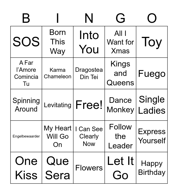 This bingo card has a free space and 37 words: Amalia, I Will Survive, Don’t Start Now, Karma Chameleon, Express Yourself, My Heart Will Go On, Dragostea Din Tei, Juice, Toy, Quando Quando, Levitating, All I Want for Xmas, Happy Birthday, Single Ladies, A Far l’Amore Comincia Tu, Engelbewaarder, Happy New Year, Into You, I Can See Clearly Now, Dance Monkey, SOS, Fuego, One Kiss, Flowers, Let’s Twist Again, Let It Go, Born This Way, I’m Coming Out, Diva, Eviva España, American Girl, Que Sera, Spinning Around, I’m Too Sexy, Follow the Leader, Kings and Queens and Roar.