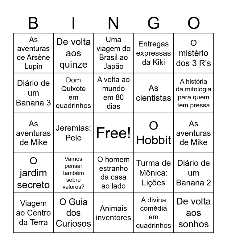 This bingo card has a free space and 56 words: A guerra dos mundos, Viagem ao Centro da Terra, Arsène Lupin contra Herlock Sholmes, As aventuras de Arsène Lupin, Animais inventores, O menino Nelson Mandela, Dom Quixote em quadrinhos, O diário de uma princesa desastrada, As cientistas, Peter Pan, Entregas expressas da Kiki, Histórias de Ninar para Garotas Rebeldes, Frankenstein, Diário de um Banana, As aventuras de Mike: mudando de casa, O plano perfeito, O mistério dos 3 R's, Jeremias: Pele, Turma de Mônica: Laços, De volta aos sonhos, O Hobbit, Star Trek: portal do tempo, Turma de Mônica: Lições, Uma viagem do Brasil ao Japão, O pequeno príncipe, A volta ao mundo em 80 dias, Vinte mil léguas submarinas, Somos todos Greta, A história da mitologia para quem tem pressa, A caçadora de árvores, Esperança para voar, Anne de Green Gables, Anne de Avonlea, Diário de um Banana 3, As aventuras de Mike, Diário de um Banana 3, As aventuras de Mike, Anne da Ilha, O jardim secreto, De volta aos quinze, O homem estranho da casa ao lado, Aprendendo inteligência, O Mágico de Oz, Darwin | Edição acessível com descrição de imagens, A rainha dos estapafúrdios, Vamos pensar também sobre valores?, O Guia dos Curiosos, Grandes gregos, O menino rei, Como fazíamos sem..., A divina comédia em quadrinhos, Simbad, o marujo, Miles Morales: Ondas de Choque, Marvel Teens: Ms. Marvel vol. 01, Diário de um Banana 2 and As aventuras de Mike: o bebê chegou.