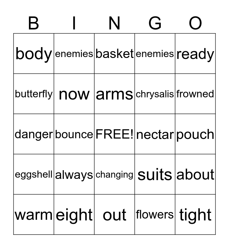 This bingo card has a free space and 24 words: always, eight, arms, warm, ready, body, butterfly, enemies, nectar, changing, chrysalis, danger, suits, about, now, flowers, pouch, basket, frowned, bounce, tight, eggshell, enemies and out.
