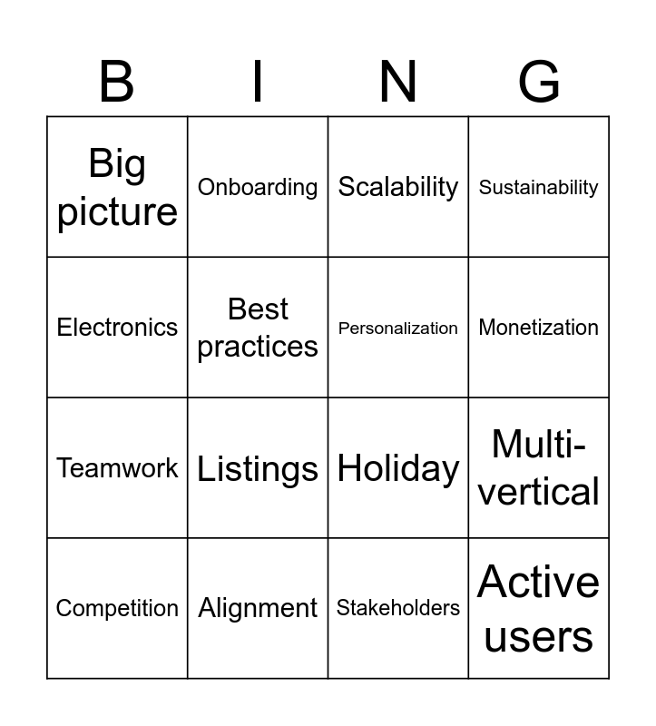 This bingo card has 16 words: Alignment, Multi-vertical, Scalability, Big picture, Teamwork, Onboarding, Holiday, Stakeholders, Electronics, Best practices, Competition, Sustainability, Listings, Monetization, Personalization and Active users.