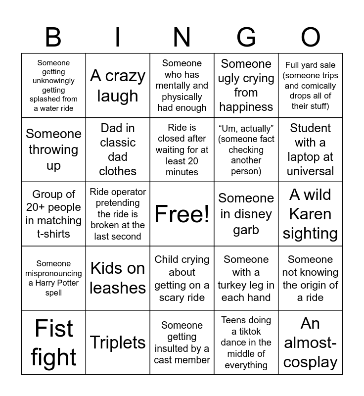 This bingo card has a free space and 24 words: Kids on leashes, Triplets, Ride is closed after waiting for at least 20 minutes, Fist fight, Full yard sale (someone trips and comically drops all of their stuff), Someone getting unknowingly getting splashed from a water ride, Someone throwing up, A crazy laugh, Someone in disney garb, Child crying about getting on a scary ride, “Um, actually” (someone fact checking another person), Group of 20+ people in matching t-shirts, Someone with a turkey leg in each hand, Someone not knowing the origin of a ride, Dad in classic dad clothes, Teens doing a tiktok dance in the middle of everything, A wild Karen sighting, Someone who has mentally and physically had enough, Student with a laptop at universal, Ride operator pretending the ride is broken at the last second, An almost-cosplay, Someone mispronouncing a Harry Potter spell, Someone ugly crying from happiness and Someone getting insulted by a cast member.