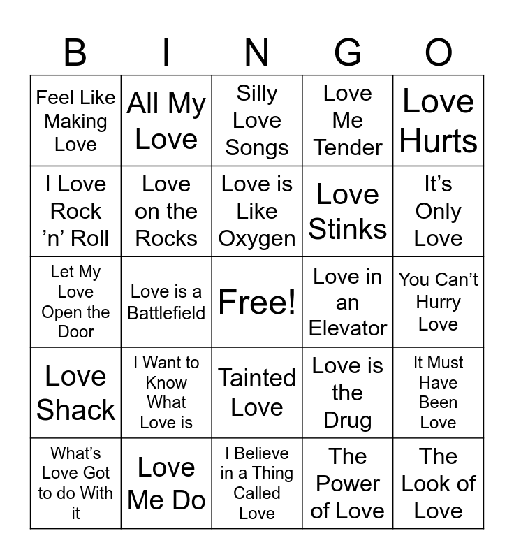 This bingo card has a free space and 38 words: Can’t Help Falling in Love, Endless Love, I’d Do Anything for Love, Love on the Rocks, It Must Have Been Love, I Want to Know What Love is, Love is Like Oxygen, Love Bites, Love Hurts, Love Stinks, Love is a Battlefield, Love Me Tender, The Look of Love, You Can’t Hurry Love, I Love Rock ’n’ Roll, Love Shack, Love Ties, Silly Love Songs, One Love, Love in an Elevator, Feel Like Making Love, Love Me Do, It’s Only Love, What’s Love Got to do With it, Sunshine of Your Love, I Believe in a Thing Called Love, Too Late for Love, Love Her Madly, The Best of My Love, Big Love, Baby I Love Your Way, Tainted Love, The Power of Love, All My Love, Why Can’t This Be Love, Love is the Drug, Let My Love Open the Door and Modern Love.