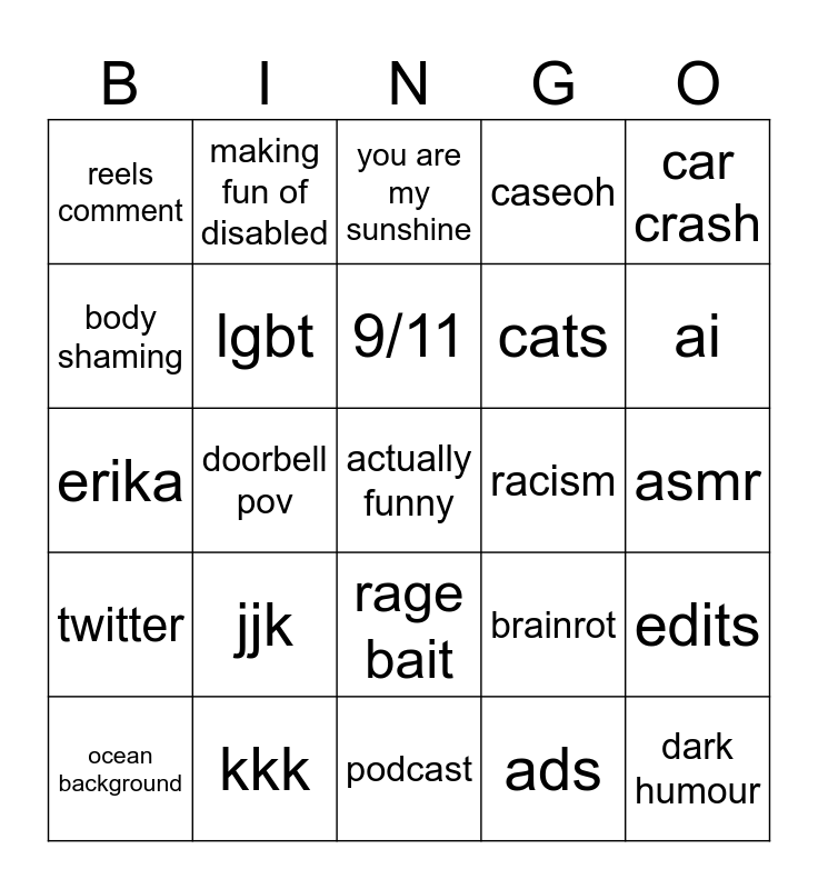 This bingo card has a free space and 24 words: jjk, kkk, 9/11, ocean background, car crash, reels comment, body shaming, making fun of disabled, racism, rage bait, cats, erika, brainrot, edits, lgbt, ads, asmr, you are my sunshine, ai, doorbell pov, dark humour, twitter, caseoh and podcast.