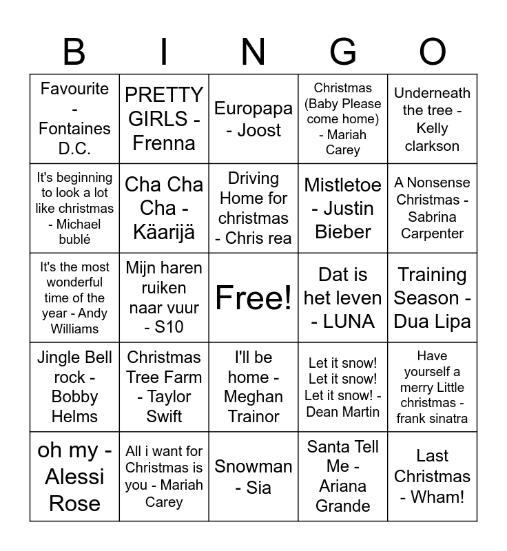 This bingo card has a free space and 29 words: oh my - Alessi Rose, we fell in love in october - Girl in red, Mijn haren ruiken naar vuur - S10, Kwijt - Froukje, Favourite - Fontaines D.C., Europapa - Joost, Cha Cha Cha - Käarijä, Christmas Tree Farm - Taylor Swift, Dat is het leven - LUNA, All i want for Christmas is you - Mariah Carey, Training Season - Dua Lipa, Last Christmas - Wham!, Snowman - Sia, Santa Tell Me - Ariana Grande, A Nonsense Christmas - Sabrina Carpenter, Rockin' Around the Christmas - Brenda Lee, I'll be home - Meghan Trainor, Jingle Bell rock - Bobby Helms, Underneath the tree - Kelly clarkson, It's the most wonderful time of the year - Andy Williams, Let it snow! Let it snow! Let it snow! - Dean Martin, Feliz Nevidad - josé Feliciano, Mistletoe - Justin Bieber, It's beginning to look a lot like christmas - Michael bublé, Christmas (Baby Please come home) - Mariah Carey, PRETTY GIRLS - Frenna, Have yourself a merry Little christmas - frank sinatra, Driving Home for christmas - Chris rea and Kerst zonder jou - Emma heesters, snelle.