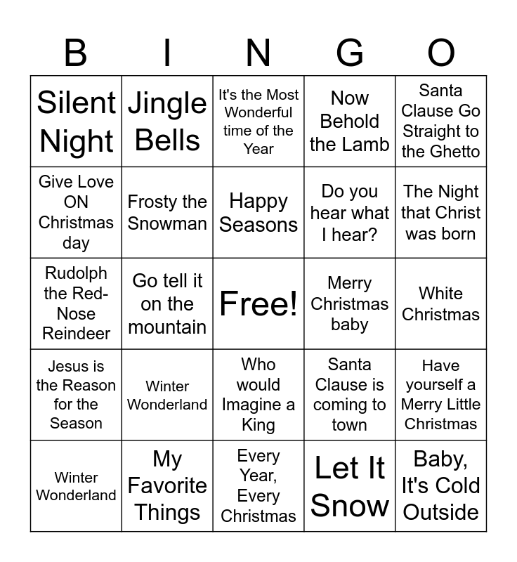 This bingo card has a free space and 24 words: Winter Wonderland, Winter Wonderland, Happy Seasons, Let It Snow, Santa Clause Go Straight to the Ghetto, Silent Night, Jingle Bells, It's the Most Wonderful time of the Year, Merry Christmas baby, White Christmas, Rudolph the Red-Nose Reindeer, Frosty the Snowman, Santa Clause is coming to town, Have yourself a Merry Little Christmas, Give Love ON Christmas day, My Favorite Things, Every Year, Every Christmas, Now Behold the Lamb, The Night that Christ was born, Jesus is the Reason for the Season, Go tell it on the mountain, Who would Imagine a King, Do you hear what I hear? and Baby, It's Cold Outside.