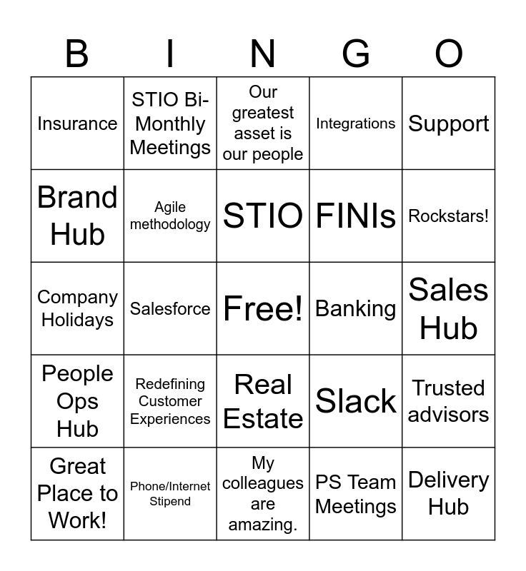 This bingo card has a free space and 37 words: We are all about People, We are Owners, We Give Back, Agile methodology, Trusted advisors, Redefining Customer Experiences, STIO, DaaS, Support, Implementation, Salesforce, Integrations, Delivery Hub, Sales Hub, Brand Hub, People Ops Hub, Fin Ops Hub, Our greatest asset is our people, Real Estate, Banking, Insurance, Rockstars!, Great Place to Work!, My colleagues are amazing., Koffee with Katie, PS Team Meetings, STIO Bi-Monthly Meetings, US, Canada & Costa Rica Team Members, To be wildly successful, to be radically generous., Health and Wellness Stipend, Professional Development, Phone/Internet Stipend, Company Holidays, Cybersecurity Courses, Slack, FINIs and To humanize the future of financial services.