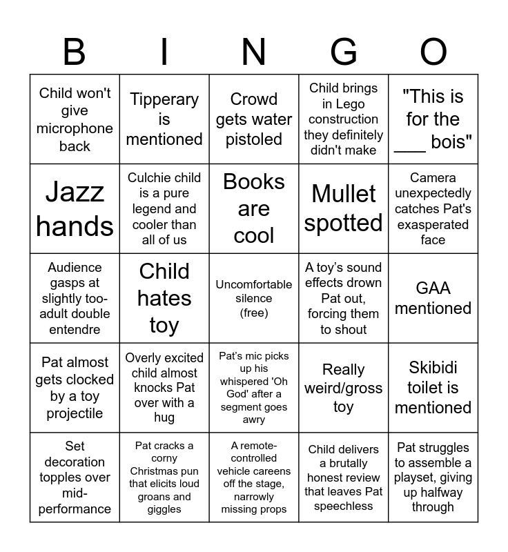 This bingo card has a free space and 44 words: Pat tries out a complicated toy and breaks it on air, Pat struggles to assemble a playset, giving up halfway through, Pat sneaks in a swear word then quickly tries to cover it up, Set decoration topples over mid-performance, A musical act goes off-key, leading to sympathetic, uncomfortable applause, Child delivers a brutally honest review that leaves Pat speechless, Crowd gets water pistoled, A kid refuses to hand back a microphone or toy, hijacking the segment, "This is for the ___ bois", Pat cracks a corny Christmas pun that elicits loud groans and giggles, Child brings in Lego construction they definitely didn't make, A toy’s sound effects drown Pat out, forcing them to shout, Pat’s mic picks up his whispered 'Oh God' after a segment goes awry, Overly excited child almost knocks Pat over with a hug, The crew visibly rushes in to fix something, trying (and failing) to stay off-camera, A remote-controlled vehicle careens off the stage, narrowly missing props, Pat blatantly checks the time, as though counting down to the show’s end, Audience gasps at slightly too-adult double entendre, Celebrity guest tries and fails to act cool while demonstrating toy, Camera unexpectedly catches Pat's exasperated face, Tipperary is mentioned, A heartwarming 'surprise reunion' moment makes half the audience tear up, Fortnite dance, Child won't give microphone back, Child openly contradicts Pat on how toy functions, GAA mentioned, Child wants to be farmer when grows up, Child terrorises Pat while driving a mini car, Really weird/gross toy, Pat almost gets clocked by a toy projectile, Non-sparkly Edward appears, Skibidi toilet is mentioned, Rizz is mentioned, Brat summer is mentioned, Child hates toy, Pat can't understand culchie accent, Political joke made, "Batteries not included", Books are cool, Jazz hands, Mullet spotted, Gender roles are reinforced, Culchie child is a pure legend and cooler than all of us and Child shot with Nerf gun.