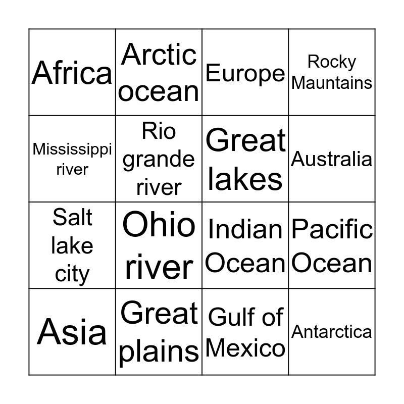 This bingo card has a free space and 15 words: Asia, Antarctica, Europe, Africa, Australia, Mississippi river, Ohio river, Gulf of Mexico, Rio grande river, Salt lake city, Pacific Ocean, Rocky Mauntains, Great lakes, Arctic ocean and Great plains.