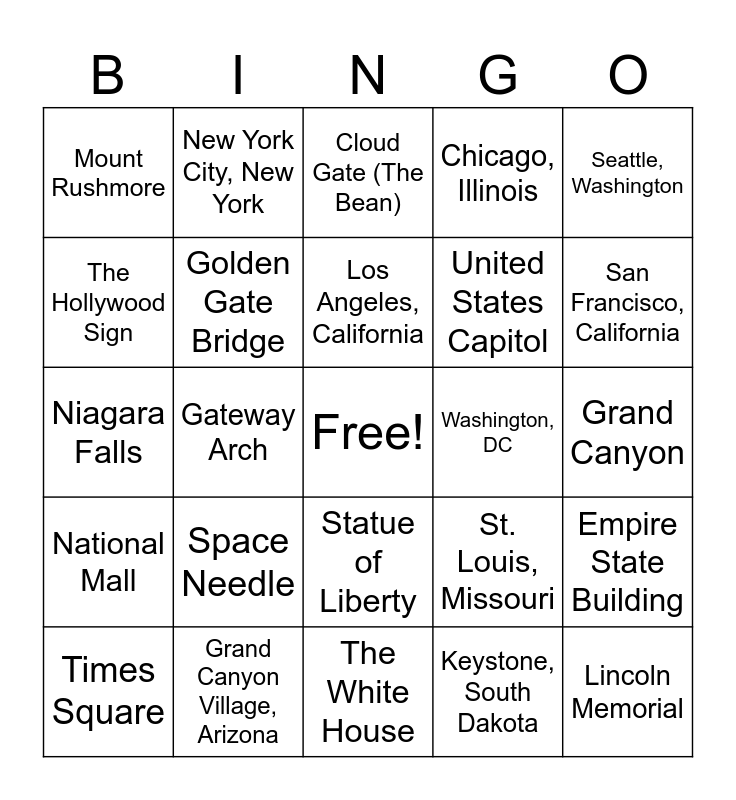 This bingo card has a free space and 24 words: Space Needle, Grand Canyon Village, Arizona, Los Angeles, California, Times Square, Seattle, Washington, Mount Rushmore, The Hollywood Sign, New York City, New York, Washington, DC, Statue of Liberty, United States Capitol, Niagara Falls, St. Louis, Missouri, Empire State Building, Golden Gate Bridge, Keystone, South Dakota, Grand Canyon, Cloud Gate (The Bean), San Francisco, California, Gateway Arch, Lincoln Memorial, National Mall, Chicago, Illinois and The White House.