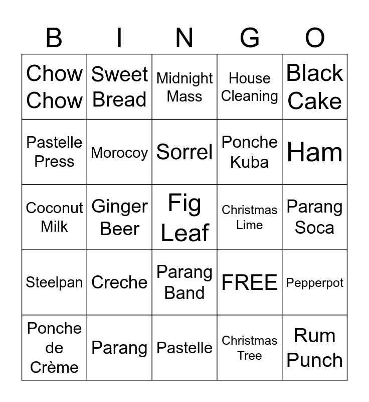 This bingo card has 25 words: Creche, Pastelle, Sorrel, Ponche de Crème, Black Cake, Chow Chow, Pastelle Press, Sweet Bread, Christmas Lime, Parang Band, Ponche Kuba, Coconut Milk, FREE, Pepperpot, Morocoy, Rum Punch, Parang Soca, Midnight Mass, Ham, Ginger Beer, Fig Leaf, Parang, Steelpan, House Cleaning and Christmas Tree.