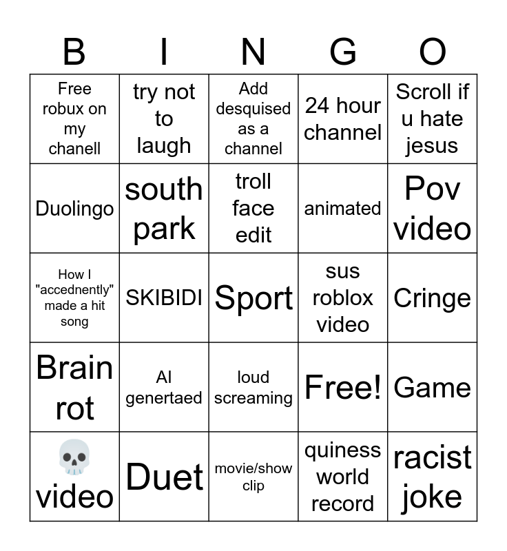 This bingo card has 25 words: AI genertaed, movie/show clip, troll face edit, 💀 video, Scroll if u hate jesus, Free robux on my chanell, Duolingo, try not to laugh, sus roblox video, loud screaming, animated, How I "accednently" made a hit song, Free!, Game, south park, racist joke, Cringe, Add desquised as a channel, Pov video, SKIBIDI, Sport, Duet, Brain rot, 24 hour channel and quiness world record.