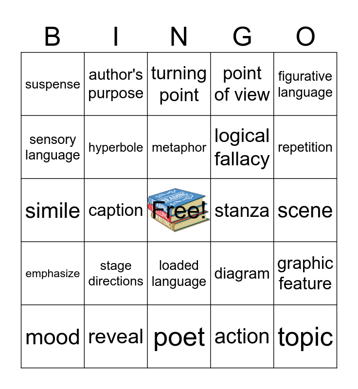 This bingo card has a free space and 78 words: plot, conflict, turning point, falling action, resolution, theme, excerpt, setting, internal conflict, external conflict, foreshadowing, influence, point of view, suspense, imagery, sensory language, playwright, stage directions, dialogue, scene, literal language, figurative language, simile, metaphor, hyperbole, personification, onomatopoeia, alliteration, rhyme, rhythm, repetition, speaker, poet, tone, mood, stanza, line breaks, lines, fact, topic, main idea, thesis, evidence, supporting detail, article, author's purpose, text organization, structure, summary, quotation, graphic feature, caption, diagram, subtitle, opinion, perspective, audience, claim, stereotyping, loaded language, logical fallacy, sweeping generalization, bandwagon appeal, circular reasoning, convey, illuminate, illustrate, highlight, emphasize, reveal, irony, infer, significant, primary, action, analogy, juxtaposition and symbolism.