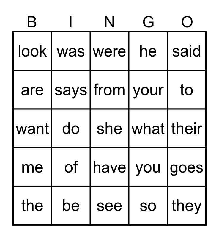 This bingo card has 25 words: of, see, from, the, said, look, are, was, what, have, your, want, you, goes, says, they, their, were, to, do, she, be, me, he and so.