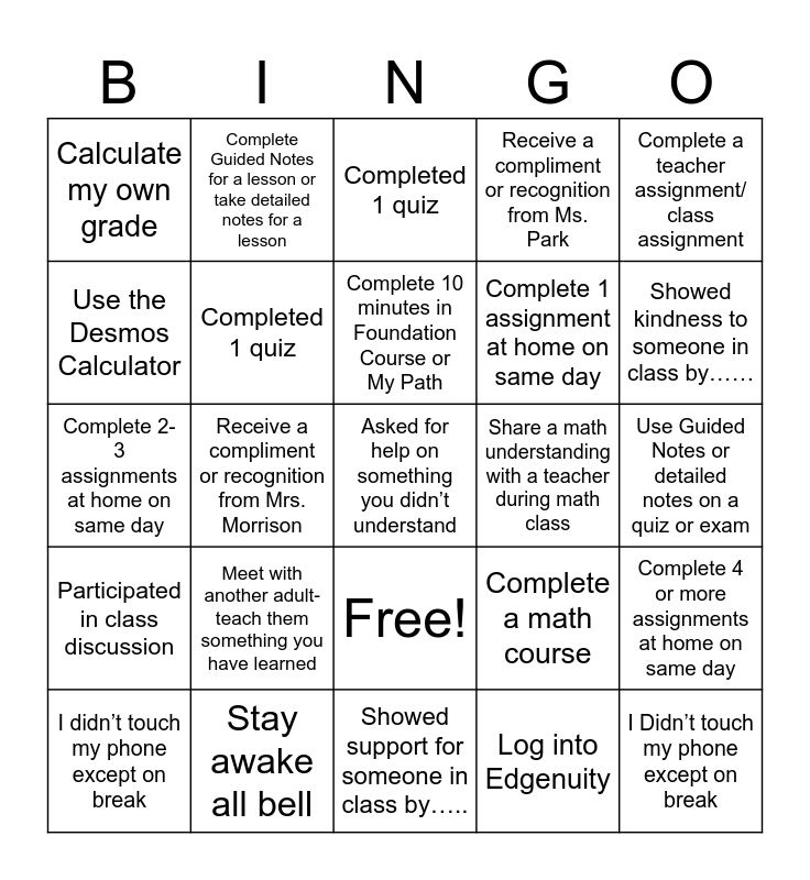 This bingo card has 26 words: Free!, Log into Edgenuity, Complete 10 minutes in Foundation Course or My Path, Stay awake all bell, Complete a teacher assignment/ class assignment, Calculate my own grade, Use the Desmos Calculator, Complete Guided Notes for a lesson or take detailed notes for a lesson, Use Guided Notes or detailed notes on a quiz or exam, Complete a math course, Complete 1 assignment at home on same day, Complete 2-3 assignments at home on same day, Complete 4 or more assignments at home on same day, I didn’t touch my phone except on break, Receive a compliment or recognition from Mrs. Morrison, Recieve a compliment or recognition from Mr. Fuller, Receive a compliment or recognition from Ms. Park, Participated in class discussion, Completed 1 quiz, Asked for help on something you didn’t understand, Showed kindness to someone in class by……, Showed support for someone in class by….., Share a math understanding with a teacher during math class, Meet with another adult-teach them something you have learned, Completed 1 quiz and I Didn’t touch my phone except on break.