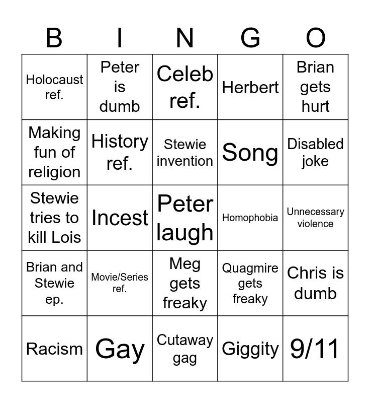 This bingo card has 29 words: Racism, 4th Wall Break, Incest, 9/11, Holocaust ref., Celeb ref., History ref., Movie/Series ref., Homophobia, Gay, Unnecessary violence, Peter laugh, Cutaway gag, Giggity, Disabled joke, Meg gets disrespected, Meg gets freaky, Brian and Stewie ep., Brian gets hurt, Stewie tries to kill Lois, Quagmire gets freaky, Sports, Song, Making fun of religion, Herbert, Peter is dumb, Chris is dumb, Stewie invention and Tom Tucker.