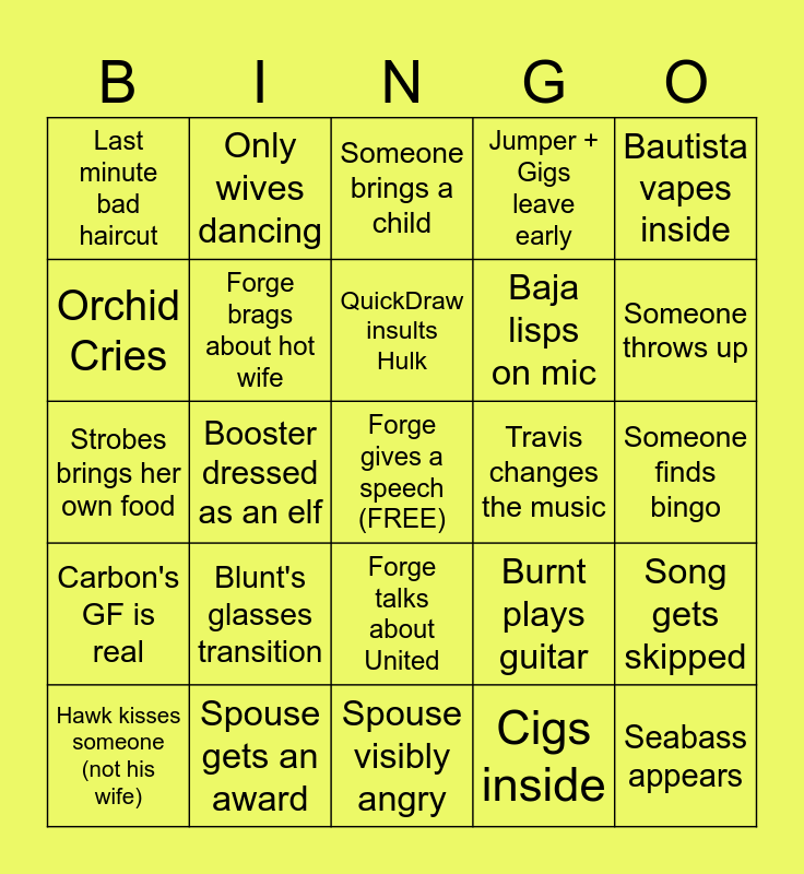 This bingo card has a free space and 24 words: Blunt's glasses transition, Spouse gets an award, QuickDraw insults Hulk, Hawk kisses someone (not his wife), Bautista vapes inside, Last minute bad haircut, Orchid Cries, Only wives dancing, Travis changes the music, Forge talks about United, Baja lisps on mic, Strobes brings her own food, Burnt plays guitar, Song gets skipped, Forge brags about hot wife, Cigs inside, Someone finds bingo, Someone brings a child, Someone throws up, Booster dressed as an elf, Seabass appears, Carbon's GF is real, Jumper + Gigs leave early and Spouse visibly angry.