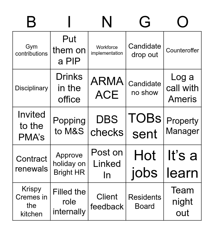 This bingo card has 28 words: It’s a learn, Can someone come out of Aspire, Candidate no show, Residents Board, Disciplinary, Workforce implementation, Put them on a PIP, Contract renewals, TOBs sent, Krispy Cremes in the kitchen, Invited to the PMA’s, Candidate drop out, Filled the role internally, Client feedback, Log a call with Ameris, Printer issues, Approve holiday on Bright HR, Drinks in the office, ARMA ACE, Post on Linked In, Gym contributions, Team night out, DBS checks, Popping to M&S, Property Manager, Hot jobs, Counteroffer and TUPE transfer.