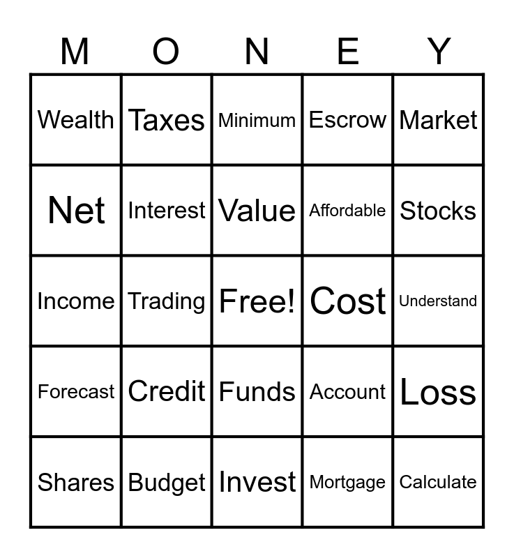 This bingo card has a free space and 49 words: Initial, Calculate, Asset, Invest, Credit, Saving, Taxes, Profit, Net, Gross, Interest, Escrow, Loss, Account, Bank, Return, Value, Cost, Strategies, Market, Trading, Mortgage, Wealth, Affordable, Inflation, Stocks, Shares, Bonds, Funds, Forecast, Prediction, Loan, Reduction, Insurance, Budget, Goal, Price, Allocate, Understand, Debt, Tackle, Avenue, Increase, Decrease, Income, Minimum, Maximum, Payment and Evaluate.