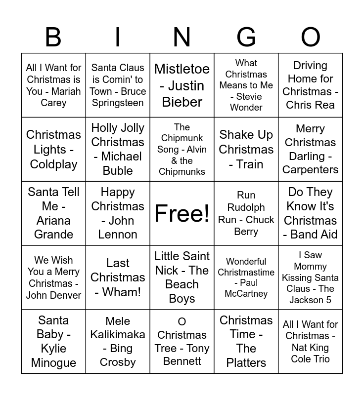 This bingo card has a free space and 29 words: Santa Baby - Kylie Minogue, Blue Christmas - Elvis Presley, Happy Christmas - John Lennon, 8 Days of Christmas - Destiny's Child, All I Want for Christmas is You - Mariah Carey, Mistletoe - Justin Bieber, Holly Jolly Christmas - Michael Buble, Last Christmas - Wham!, Run Rudolph Run - Chuck Berry, Mele Kalikimaka - Bing Crosby, Do They Know It's Christmas - Band Aid, All I Want for Christmas - Nat King Cole Trio, O Christmas Tree - Tony Bennett, Christmas Time - The Platters, Merry Christmas Darling - Carpenters, Baby, It's Cold Outside - Dean Martin, Little Saint Nick - The Beach Boys, We Wish You a Merry Christmas - John Denver, Driving Home for Christmas - Chris Rea, Santa Tell Me - Ariana Grande, Wonderful Christmastime - Paul McCartney, Underneath the Tree - Kelly Clarkson, Shake Up Christmas - Train, Christmas Lights - Coldplay, What Christmas Means to Me - Stevie Wonder, Santa Claus is Comin' to Town - Bruce Springsteen, I Saw Mommy Kissing Santa Claus - The Jackson 5, The Chipmunk Song - Alvin & the Chipmunks and Please Come Home - Eagles.