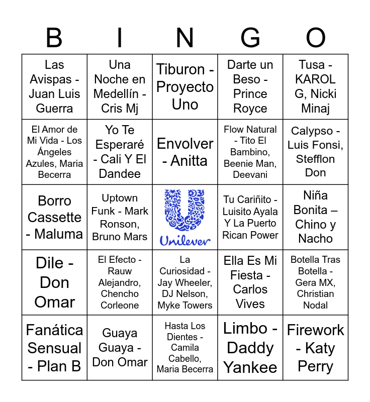 This bingo card has a free space and 290 words: APT. - ROSÉ, Bruno Mars, Ay Mi Dios - IAmChino, Pitbull, Yandel, El Chacal, Hasta Los Dientes - Camila Cabello, Maria Becerra, LUNA - Feid, ATL Jacob, Levitating - Dua Lipa, Blinding Lights - The Weeknd, As It Was - Harry Styles, Paint The Town Red - Doja Cat, Columbia - Quevedo, Tití Me Preguntó - Bad Bunny, Titanium (feat. Sia) - David Guetta, Sia, TQG - KAROL G, Shakira, Quevedo: Bzrp Music Sessions, Vol. 52 - Bizarrap, Quevedo, Shakira: Bzrp Music Sessions, Vol. 53 - Bizarrap, Shakira, Tusa - KAROL G, Nicki Minaj, Si Antes Te Hubiera Conocido - KAROL G, MAMIII - Becky G, KAROL G, AMARGURA - KAROL G, Feliz Cumpleaños Ferxxo - Feid, Todo De Ti - Rauw Alejandro, El Efecto - Rauw Alejandro, Chencho Corleone, Envolver - Anitta, LALA - Myke Towers, DESPECHÁ - ROSALÍA, Dile - Don Omar, Danza Kuduro - Don Omar, Lucenzo, Salió El Sol - Don Omar, Dutty Love - Don Omar, NATTI NATASHA, Beggin' – Måneskin, Criminal - NATTI NATASHA, Ozuna, CAN'T STOP THE FEELING! - Justin Timberlake, Uptown Funk - Mark Ronson, Bruno Mars, Hips Don't Lie - Shakira, Wyclef Jean, Firework - Katy Perry, Botella Tras Botella - Gera MX, Christian Nodal, Ella Baila Sola - Eslabon Armado, Peso Pluma, Dance Monkey - Tones And I, Havana (feat. Young Thug) - Camila Cabello, Young Thug, Perdonarte, ¿Para Qué? - Los Ángeles Azules, Emilia, Miénteme - TINI, Maria Becerra, un x100to - Grupo Frontera, Bad Bunny, MI EX TENÍA RAZÓN - KAROL G, POR QUÉ SERÁ - Grupo Frontera, Maluma, ¿Qué Más Pues? - J Balvin, Maria Becerra, La Despedida - Daddy Yankee, Caraluna - Bacilos, Una Noche en Medellín - Cris Mj, Candy - Plan B, Chulo pt.2 - Bad Gyal, Tokischa, Young Miko, UNA NOCHE EN MEDELLÍN - REMIX - KAROL G, Cris Mj, Ryan Castro, Efecto - Bad Bunny, Moscow Mule - Bad Bunny, Me Porto Bonito - Bad Bunny, Chencho Corleone, La Jeepeta - Remix - Nio Garcia, Anuel AA, Myke Towers, Brray, Juanka, El Amor de Mi Vida - Los Ángeles Azules, Maria Becerra, Ella Y Yo - Aventura, Don Omar, Lo Que Pasó, Pasó - Daddy Yankee, Noche De Sexo - Wisin & Yandel, Romeo Santos, Quiero Bailar - Ivy Queen, Na De Na - Angel Y Khriz, Gocho, John Eric, Fanática Sensual - Plan B, Callaita - Bad Bunny, Tainy, Safaera - Bad Bunny, Jowell & Randy, Ñengo Flow, Sexy Movimiento - Wisin & Yandel, Noche De Entierro - Daddy Yankee, Wisin & Yandel, Zion, Hector, Tonny Tun Tun, Siente El Boom - Tito El Bambino, Randy, Pasarela - Ñejo & Dalmata, Flow Natural - Tito El Bambino, Beenie Man, Deevani, Tumba la Casa - Remix - Alexio, Daddy Yankee, Nicky Jam, Farruko, Arcángel, De La Ghetto, Zion, Ñengo Flow, Mayor Que Yo - Wisin & Yandel, Ojitos Chiquitos - Don Omar, Tu Príncipe - Daddy Yankee, Zion & Lennox, ¿Qué Tengo Que Hacer? - Daddy Yankee, Si No Le Contesto - Plan B, La Nueva Y La Ex - Daddy Yankee, Sensacion Del Bloque - De La Ghetto, Randy, Perdóname - La Factoria, Eddy Lover, Freakytona - Plan B, Boy Wonder CF, Mi Vecinita - Plan B, Vale la Pena - Juan Luis Guerra, La Bilirrubina - Juan Luis Guerra, La Travesia - Juan Luis Guerra, Ella Es Mi Fiesta - Carlos Vives, Como Yo - Juan Luis Guerra, Las Avispas - Juan Luis Guerra, Tu Eres Ajena - Eddy Herrera, Procura - ChiChi Peralta, Jandy Feliz, Tú Con Él - Frankie Ruiz, Talento De Televisión - Willie Colón, Te Va A Doler - Maelo Ruiz, Me Hace Daño Verte - Fresto Music, Yo Te Esperaré - Cali Y El Dandee, Soltera - Shakira, TQG - KAROL G, Shakira, Puntería - Shakira, Cardi B, Fireball (feat. John Ryan) - Pitbull, John Ryan, No Me Acuerdo - Thalia, NATTI NATASHA, Gasolina - Daddy Yankee, La Bachata - Manuel Turizo, Con Altura - ROSALÍA, J Balvin, El Guincho, Miénteme - TINI, Maria Becerra, Bailando - Enrique Iglesias, Descemer Bueno, Gente De Zona, La Curiosidad - Jay Wheeler, DJ Nelson, Myke Towers, Calypso - Luis Fonsi, Stefflon Don, Virtual Diva - Don Omar, Pose - Daddy Yankee, Ella Me Levanto - Daddy Yankee, Gyal You a Party Animal - Charly Black, Daddy Yankee, Shower - Becky G, BICHOTA - KAROL G, Sin Pijama - Becky G, NATTI NATASHA, Guaya Guaya - Don Omar, Limbo - Daddy Yankee, Desde Esa Noche - Thalia, Maluma, Taboo - Don Omar, Lovumba - Daddy Yankee, Me Vale - Maná, La Gozadera - Gente De Zona, Marc Anthony, Tu Cariñito - Luisito Ayala Y La Puerto Rican Power, Me Enamoro De Ella – Juan Luís Guerra, Llamado de Emergencia - Daddy Yankee, La Botella - Mach & Daddy, Tiburon - Proyecto Uno, Es un Secreto - Plan B, Borro Cassette - Maluma, El Chico Del Apartamento 512 - Selena, Vale La Pena - Juan Luis Guerra, Darte un Beso - Prince Royce, PERRO NEGRO - Bad Bunny, Feid, Candy - Plan B, Atrévete-Te-Te - Calle 13, VAGABUNDO - Sebastian Yatra, Manuel Turizo, Beéle, De Música Ligera - Soda Stereo, Persiana Americana - Soda Stereo, Conteo regresivo – Gilberto Santa Rosa, Te encontré – El Vega, Hasta abajo – Don Omar, Laura no está – Nek, La Guitarra – Los auténticos decadentes, Mi joven profesor de amor – Katty Egas, Suavemente – Elvis Crespo, Mayonesa – Chocolate, La Vida es un carnaval – Celia Cruz, Niña Bonita – Chino y Nacho, Sopa de Caracol – Banda blanca, APT. - ROSÉ, Bruno Mars, Ay Mi Dios - IAmChino, Pitbull, Yandel, El Chacal, Hasta Los Dientes - Camila Cabello, Maria Becerra, LUNA - Feid, ATL Jacob, Levitating - Dua Lipa, Blinding Lights - The Weeknd, As It Was - Harry Styles, Paint The Town Red - Doja Cat, Columbia - Quevedo, Tití Me Preguntó - Bad Bunny, Titanium (feat. Sia) - David Guetta, Sia, TQG - KAROL G, Shakira, Quevedo: Bzrp Music Sessions, Vol. 52 - Bizarrap, Quevedo, Shakira: Bzrp Music Sessions, Vol. 53 - Bizarrap, Shakira, Tusa - KAROL G, Nicki Minaj, Si Antes Te Hubiera Conocido - KAROL G, MAMIII - Becky G, KAROL G, AMARGURA - KAROL G, Feliz Cumpleaños Ferxxo - Feid, Todo De Ti - Rauw Alejandro, El Efecto - Rauw Alejandro, Chencho Corleone, Envolver - Anitta, LALA - Myke Towers, DESPECHÁ - ROSALÍA, Dile - Don Omar, Danza Kuduro - Don Omar, Lucenzo, Salió El Sol - Don Omar, Dutty 