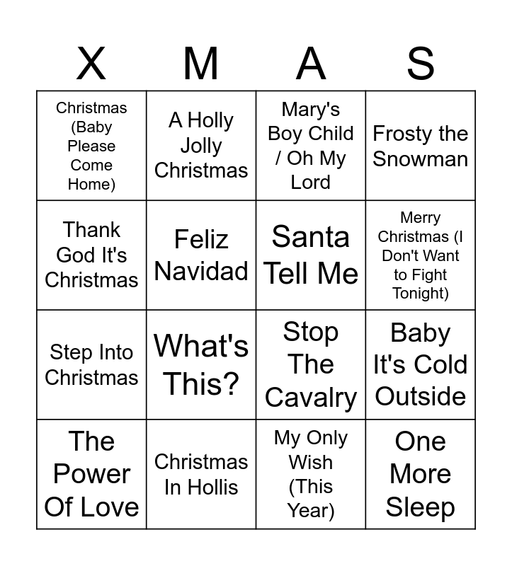 This bingo card has 24 words: Blue Christmas, White Christmas, Merry Christmas (I Don't Want to Fight Tonight), 2000 Miles - 2007 Remaster, Thank God It's Christmas, Christmas (Baby Please Come Home), Feliz Navidad, A Holly Jolly Christmas, Christmas In Hollis, 2 Become 1, Step Into Christmas, Stop The Cavalry, Rudolph The Red Nosed Reindeer, Christmas Lights, Santa Tell Me, Underneath the Tree, My Only Wish (This Year), Mary's Boy Child / Oh My Lord, What's This?, Baby It's Cold Outside, The Power Of Love, One More Sleep, Frosty the Snowman and DJ Play A Christmas Song.