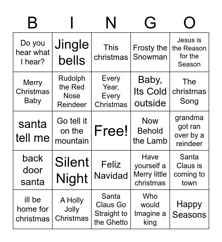 This bingo card has a free space and 50 words: Winter Wonderland, Happy Seasons, Let it Snow, Santa Claus Go Straight to the Ghetto, Silent Night, Sleigh Ride, Jingle bells, It's the Most Wonderful time of the Year, Merry Christmas Baby, White Christmas, Rudolph the Red Nose Reindeer, Frosty the Snowman, Santa Claus is coming to town, Have yourself a Merry little christmas, Give love on Christmas Day, My Favorite Things, Every Year, Every Christmas, Now Behold the Lamb, The Night that Christ was born, Jesus is the Reason for the Season, Go tell it on the mountain, Who would Imagine a king, Do you hear what I hear?, Baby, Its Cold outside, Some day at christmas, Silver Bells, The christmas Song, Joy to the world, This christmas, Feliz Navidad, Frosty the Snowman, Rockin around the Christmas tree, Jingle bell rock, Blue christmas, A Holly Jolly Christmas, Here comes santa claus, Deck the Halls, Run rudolph run, up on the housetop, grandma got ran over by a reindeer, o christmas tree, o holy night, the first noel, little drummer boy, ill be home for christmas, santa tell me, oh come all ye faithful, sould christmas, back door santa and Presents for Christmas.