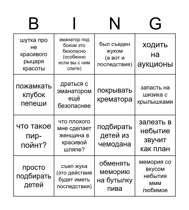 This bingo card has 16 words: съел жука (это действие будет иметь последствия), залезть в небытие звучит как план, был съеден жуком (а вот и последствия), шутка про не красивого рыцаря красоты, что такое пир-пойнт?, эманатор под боком это безопасно (особенно если вы с ним спите), подбирать детей из чемодана, обменять меморию на бутылку пива, пожамкать клубок пепеши, драться с эманатором ещё безопаснее, просто подбирать детей, ходить на аукционы, что плохого мне сделает женщина в красивой шляпе?, запасть на шизика с крылышками, покрывать крематора and мемория со вкусом небытия ммм любимое.