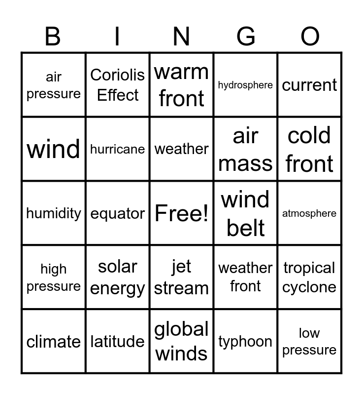 This bingo card has a free space and 24 words: solar energy, latitude, weather, climate, current, air pressure, wind, Coriolis Effect, wind belt, jet stream, air mass, humidity, weather front, tropical cyclone, hurricane, typhoon, atmosphere, warm front, cold front, equator, low pressure, high pressure, hydrosphere and global winds.