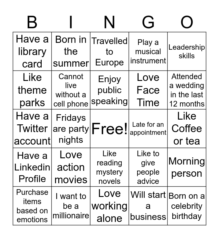This bingo card has a free space and 24 words: Love action movies, I want to be a millionaire, Enjoy public speaking, Purchase items based on emotions, Leadership skills, Have a library card, Like theme parks, Born in the summer, Late for an appointment, Like reading mystery novels, Love Face Time, Have a Twitter account, Like to give people advice, Morning person, Cannot live without a cell phone, Will start a business, Like Coffee or tea, Travelled to Europe, Attended a wedding in the last 12 months, Fridays are party nights, Born on a celebrity birthday, Have a Linkedin Profile, Play a musical instrument and Love working alone.