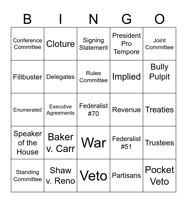 This bingo card has a free space and 24 words: Baker v. Carr, Shaw v. Reno, Rules Committee, Standing Committee, Joint Committee, Conference Committee, Filibuster, Cloture, Revenue, War, Implied, Enumerated, Federalist #51, Trustees, Delegates, Partisans, Treaties, Signing Statement, Bully Pulpit, Executive Agreements, Pocket Veto, Speaker of the House, President Pro Tempore and Veto.