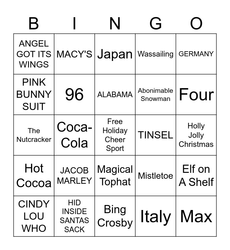 This bingo card has a free space and 24 words: JACOB MARLEY, HID INSIDE SANTAS SACK, ALABAMA, CINDY LOU WHO, GERMANY, ANGEL GOT ITS WINGS, PINK BUNNY SUIT, MACY'S, TINSEL, Magical Tophat, Abonimable Snowman, The Nutcracker, Mistletoe, Elf on A Shelf, 96, Italy, Holly Jolly Christmas, Japan, Four, Coca-Cola, Max, Hot Cocoa, Wassailing and Bing Crosby.