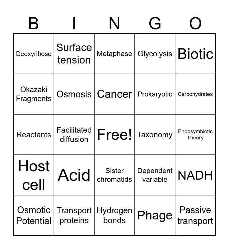 This bingo card has a free space and 153 words: Hypothesis, Independent variable, Dependent variable, Constant, Control Group, Experimental Group, Observation, Inference, Scientific Theories, Scientific Laws, Quantitative, Qualitative, Prokaryotic, Eukaryotic, Endosymbiotic Theory, Biotic, Abiotic, Organelle, Homeostasis, Metabolism, Nucleic Acid, Vaccine, Antibiotic, Lytic Cycle, Lysogenic Cycle, Pathogen, Phage, Host cell, Capsid, Tail, Tail Fibers, Surface Markers, Prokaryote, Eukaryote, Autotroph, Heterotroph, Multicellular, Unicellular, Archaebacteria, Eubacteria, Protista, Fungi, Taxonomy, Binomial Nomenclature, Asexual Reproduction, Sexual ReproductionEnzyme, Active Site, Substrate, Activation energy, Monomer, Polymer, Carbohydrates, Lipids, Proteins, Nucleic Acids, Hydrolysis, Dehydration Synthesis, Polarity, Cohesion, Adhesion, Surface tension, Specific heat, Capillary action, Hydrogen bonding, pH, Disassociation, Acid, Base, Phospholipid bi-layer, Hydrophilic, Hydrophobic, Semi/selectively permeable, Transport proteins, Channel Proteins, Carrier Proteins, Receptor proteins, Glycoproteins, Enzymatic proteins, Active transport, Endocytosis, Exocytosis, Passive transport, Diffusion, Facilitated diffusion, Osmosis, Hypotonic Solution, Hypertonic Solution, Isotonic Solution, Osmotic Potential, Deoxyribose, Nucleotide, Hydrogen bonds, Double helix, Antiparallel, Semiconservative, Chargaff’s Rule, Helicase, Primase, Polymerase, Ligase, Mutagens, Okazaki Fragments, Leading/lagging strands, Purines/Pyrimidines, Interphase, G1, S, G2, G0, Mitotic (M) Phase, Mitosis, Prophase, Metaphase, Anaphase, Telophase, Cytokinesis, Cell plate/cleavage furrow, Chromatin, Sister chromatids, Chromosome, Centrioles, Spindle fibers, Nuclear envelope/membrane, Cancer, ATP, ADP, Products, Reactants, Mitochondria, Aerobic Respiration, Glycolysis, Krebs Cycle, Electron Transport Chain, Anaerobic Respiration,, Glycolysis, Fermentation, Glucose, Pyruvate/Pyruvic Acid, NADH, FADH2, NADPH, Xylem, Phloem, Guard Cells, Stomata, Chloroplast, Chlorophyll, Light-dependent reactions, Calvin Cycle, Solar energy, Chemical energy, Photosystems and G3P.