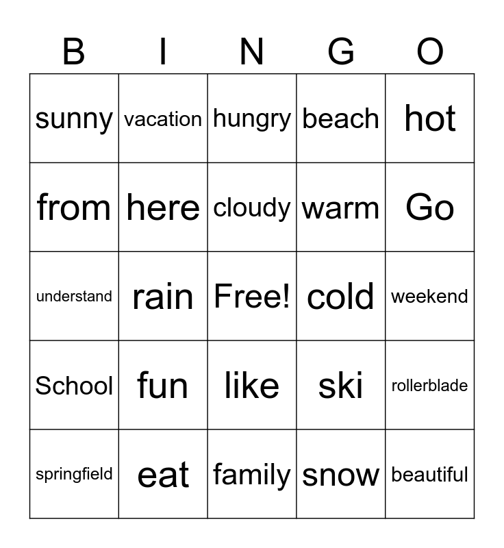 This bingo card has a free space and 49 words: a lot of, beautiful, activity, family, fun, you and me, vacation, born, from, grow up, here, beach, rollerblade, ski, visit, weather, cloudy, cold, cool, hot, rain, snow, sunny, warm, Favorite, Go, springfield, Today, like, School, what, home, can't, Why, eat, walk, party, jump, weekend, Excited, friend, absent, clear, important, understand, hungry, Practice, improve and don't ask me.