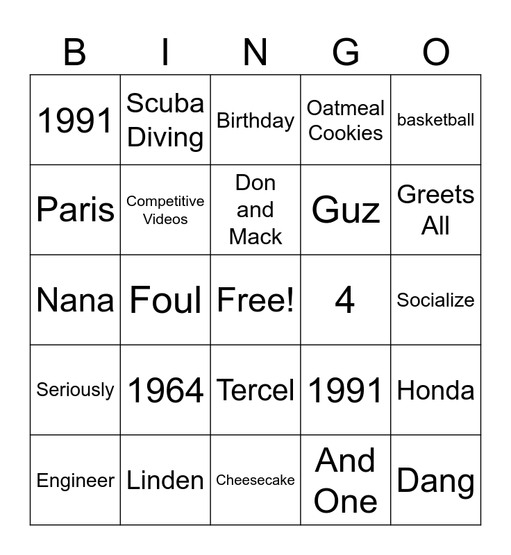 This bingo card has a free space and 24 words: 1964, Linden, Don and Mack, Engineer, basketball, 1991, Paris, Scuba Diving, 4, Tercel, Guz, Nana, 1991, Honda, Competitive Videos, And One, Socialize, Birthday, Greets All, Foul, Dang, Seriously, Oatmeal Cookies and Cheesecake.