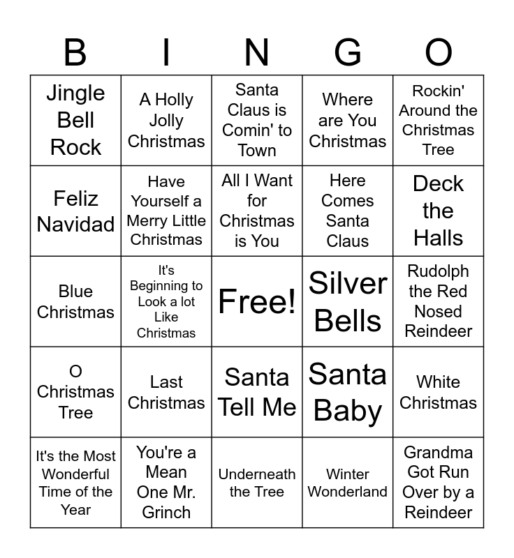 This bingo card has a free space and 24 words: Last Christmas, You're a Mean One Mr. Grinch, All I Want for Christmas is You, It's the Most Wonderful Time of the Year, Rockin' Around the Christmas Tree, Jingle Bell Rock, Feliz Navidad, A Holly Jolly Christmas, Silver Bells, Santa Tell Me, Here Comes Santa Claus, Blue Christmas, Santa Baby, White Christmas, Have Yourself a Merry Little Christmas, Winter Wonderland, Rudolph the Red Nosed Reindeer, Santa Claus is Comin' to Town, Deck the Halls, It's Beginning to Look a lot Like Christmas, Grandma Got Run Over by a Reindeer, O Christmas Tree, Where are You Christmas and Underneath the Tree.