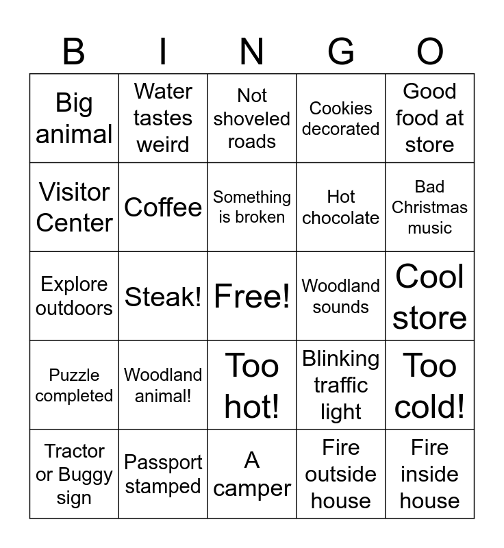 This bingo card has a free space and 24 words: Woodland animal!, Passport stamped, Something is broken, Tractor or Buggy sign, Good food at store, Big animal, Visitor Center, Water tastes weird, Woodland sounds, Too hot!, Hot chocolate, Explore outdoors, Blinking traffic light, Too cold!, Coffee, Fire outside house, Cool store, Not shoveled roads, Bad Christmas music, Steak!, Fire inside house, Puzzle completed, Cookies decorated and A camper.