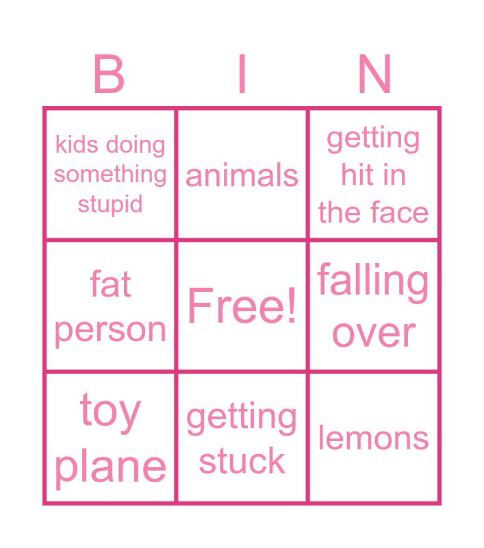This bingo card has a free space and 8 words: falling over, getting hit in the face, animals, toy plane, kids doing something stupid, lemons, fat person and getting stuck.