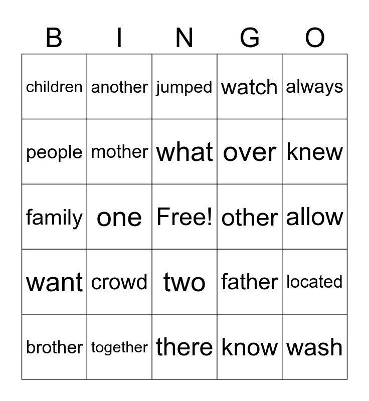 This bingo card has a free space and 24 words: crowd, together, what, brother, always, children, people, another, other, two, over, family, father, located, mother, know, allow, jumped, knew, one, wash, want, watch and there.