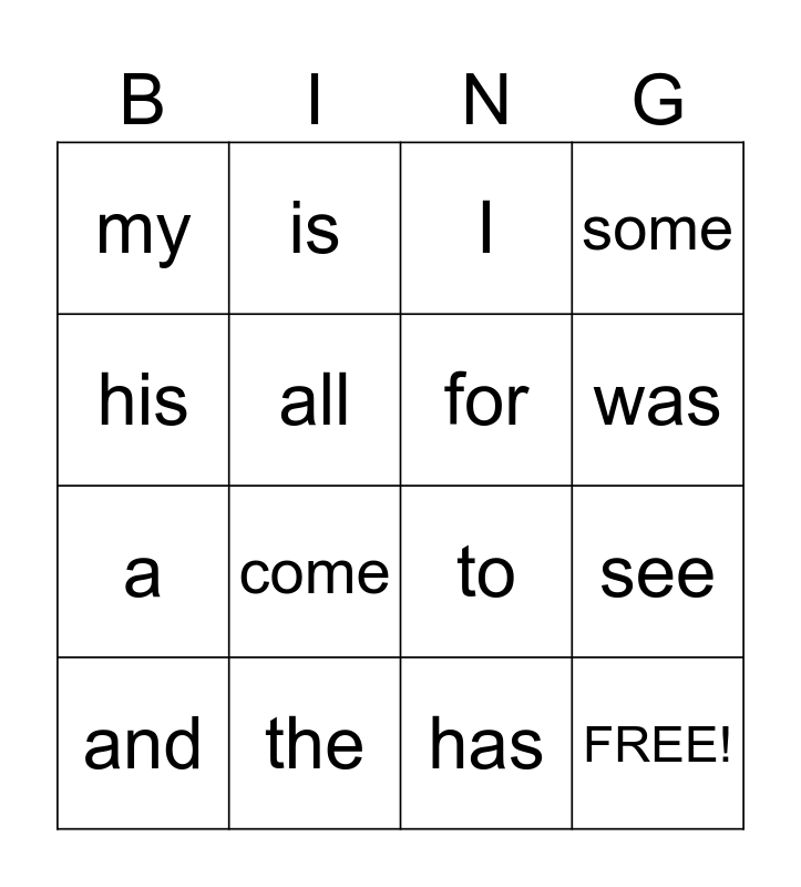 This bingo card has 16 words: the, see, I, my, a, is, to, has, his, all, and, some, come, was, for and FREE!.