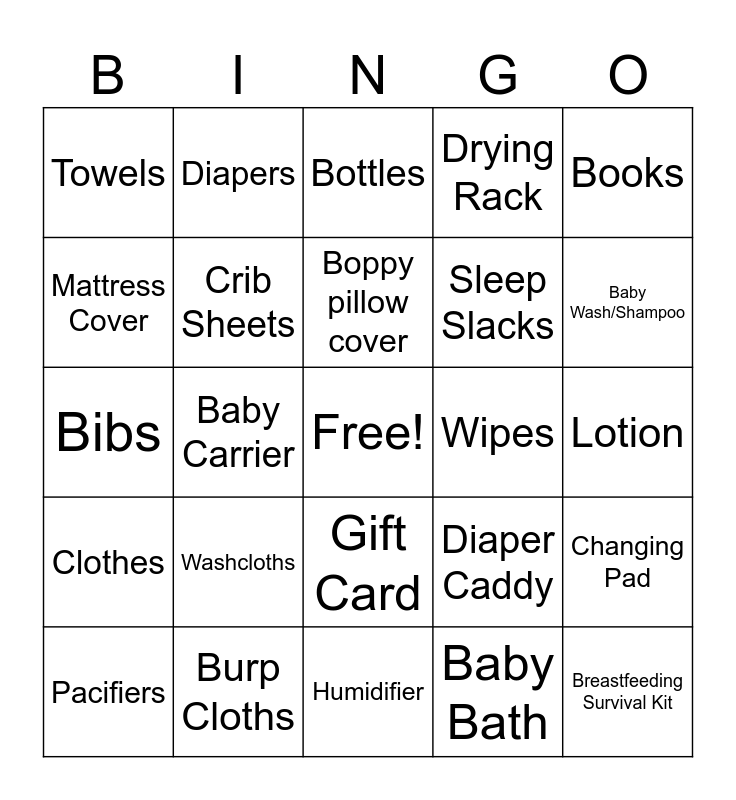 This bingo card has a free space and 24 words: Washcloths, Burp Cloths, Boppy pillow cover, Pacifiers, Books, Towels, Mattress Cover, Diapers, Wipes, Gift Card, Sleep Slacks, Bibs, Diaper Caddy, Changing Pad, Crib Sheets, Baby Bath, Lotion, Bottles, Baby Wash/Shampoo, Baby Carrier, Breastfeeding Survival Kit, Clothes, Drying Rack and Humidifier.