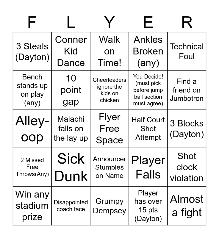 This bingo card has a free space and 33 words: Cheerleader Falls, 5 Fouls (Dayton), Malachi falls on the lay up, 4 Threes (Dayton), 2 Missed Free Throws(Any), 10 point gap, Technical Foul, Win any stadium prize, Conner Kid Dance, Cat and the Hat Dance, Cheerleaders ignore the kids on chicken, Walk on Time!, Student Section Heckling, 10 Fouls (Dayton), Half Court Shot Attempt, Find a friend on Jumbotron, Disappointed coach face, Alley-oop, Sick Dunk, Player Falls, Announcer Stumbles on Name, Player in Walking Boot (any), 3 Steals (Dayton), 3 Blocks (Dayton), Grumpy Dempsey, Almost a fight, Ankles Broken (any), You Decide! (must pick before jump ball section must agree), Bench stands up on play (any), Shot clock violation, Bounce Pass, Player has over 15 pts (Dayton) and Double Double.