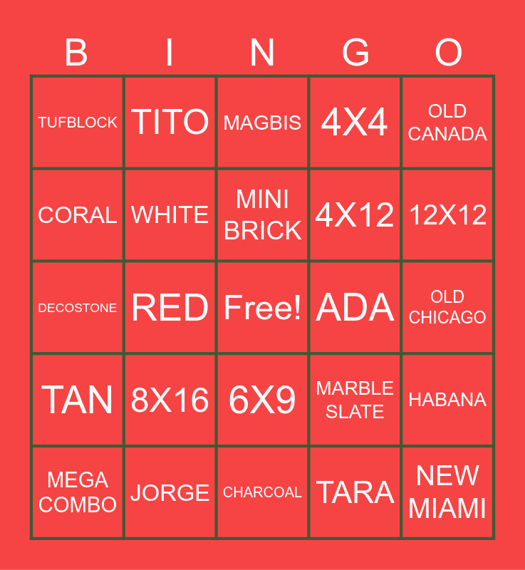This bingo card has a free space and 39 words: MIX 3, OLD MIAMI, AZUL, WHITE, MEGA COMBO, 6X9, MINI BRICK, NATURAL GRAY, OLD CANADA, TAN, RED, 4X4, NEW MIAMI, OLD CHICAGO, ADA, 8X16, TAN SANDSTONE, TUFBLOCK, SLATE, MARBLE SLATE, CORAL, CHARCOAL, 4X12, 12X12, SANDSTONE, PEACH/CORAL, TAN/CHARCOAL, OLIVA, AMARETTO, TITO, CESAR, JAGUAR, MAGBIS, JORGE, TARA, ECOBLOCK, HABANA, DECOSTONE and ODALYS.